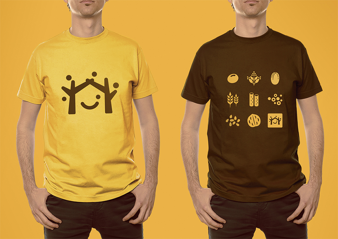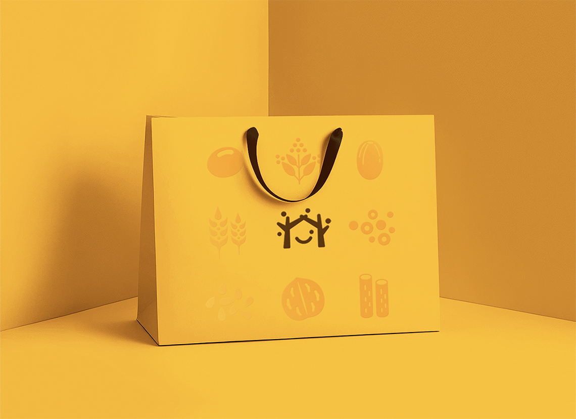 為解決五谷磨房原有品牌形象面臨的問題,全新的logo采用圖形標(biāo)加中文字的組合形式,Logo的整體設(shè)計(jì)簡單而富有親和力。品牌形象設(shè)計(jì)由五顆谷粒以及兩棵枝丫相連的樹圍繞著微笑的符號展開,如同父母牽手為家人搭起一個(gè)充滿歡樂的家,傳遞的是關(guān)愛與呵護(hù)的品牌愿景,同時(shí)也寓意著企業(yè)的不斷成長,以及“以人為本”的經(jīng)營理念。