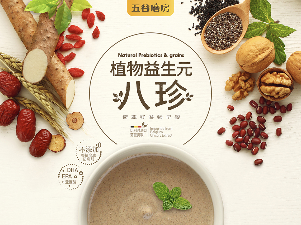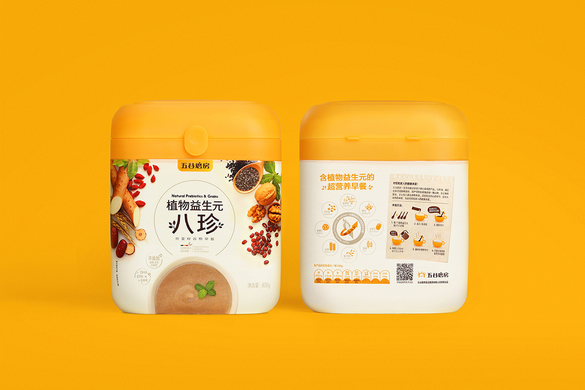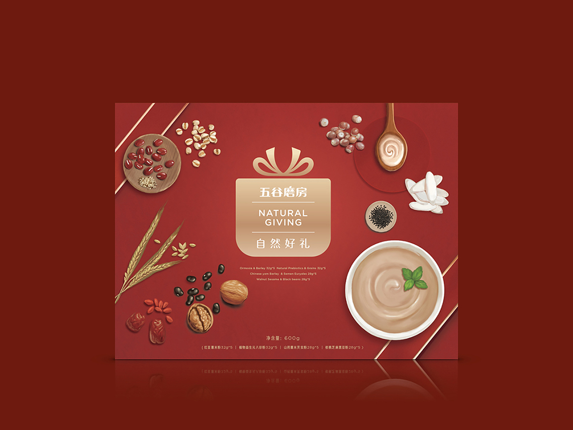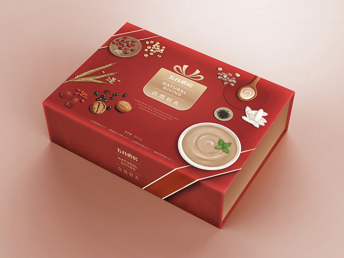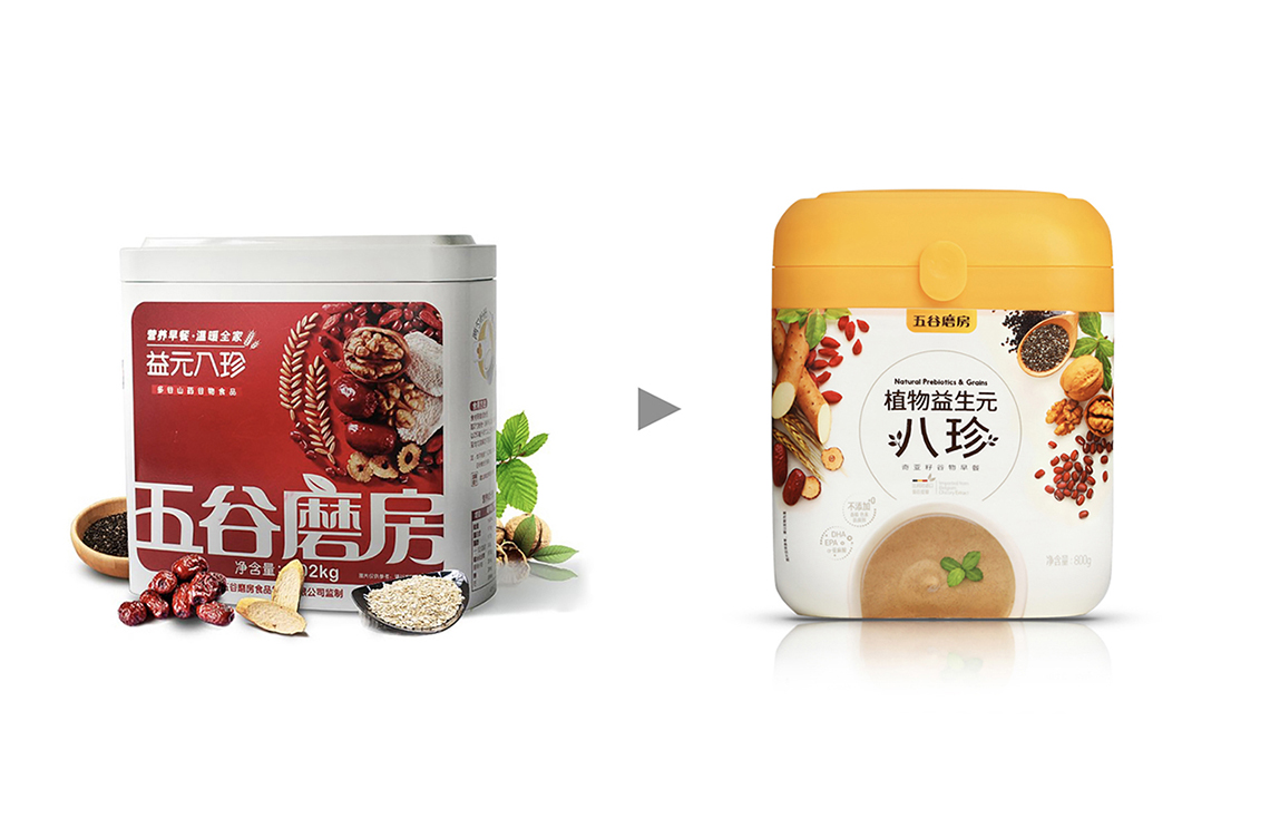 隨著品牌形象的更新,五谷磨房的明星產(chǎn)品“益元八珍”包裝也全面升級,更名為“植物益生元八珍”,為了更好地將五谷“天然、健康、養(yǎng)元、產(chǎn)品材料多元化”的概念與設(shè)計(jì)相結(jié)合,包裝畫面采用健康天然的五谷原材料,搭配象征綠色生態(tài)的顏色組合,使包裝整體視覺呈現(xiàn)清新自然,終端陳列上與周邊產(chǎn)品相比,色彩突出,品牌整體調(diào)性表現(xiàn)充分。益元八珍產(chǎn)品新包裝一經(jīng)上市,月銷售額突破3000萬元,并贏得一致好評。