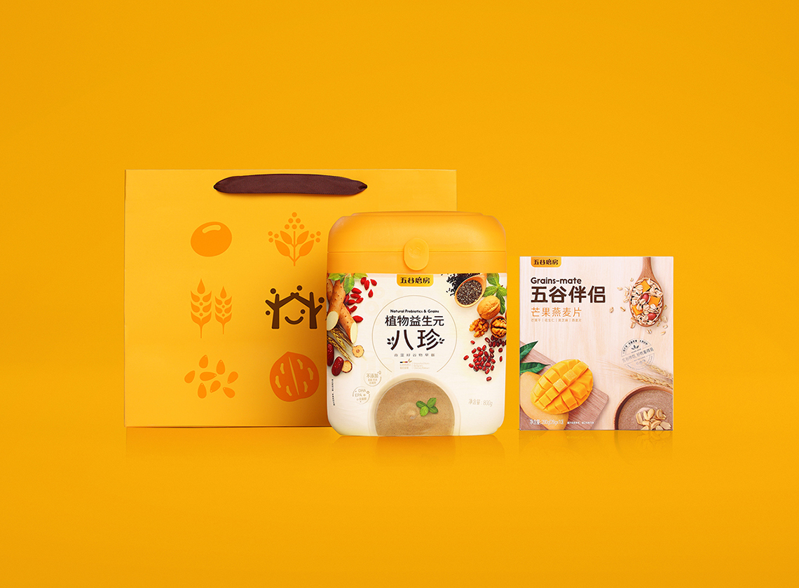 “食材原料包”主要采用透明食材材質(zhì),目的是為了更大面積向消費(fèi)者展示原材料。綜合谷物色彩特征,外包裝色彩與谷物色系保持相對一致性,同時(shí)運(yùn)用品牌圖標(biāo)的元素構(gòu)圖,使其更具整體性。