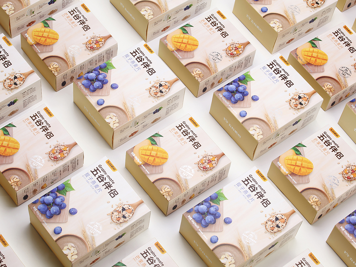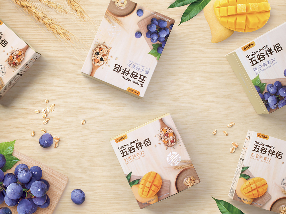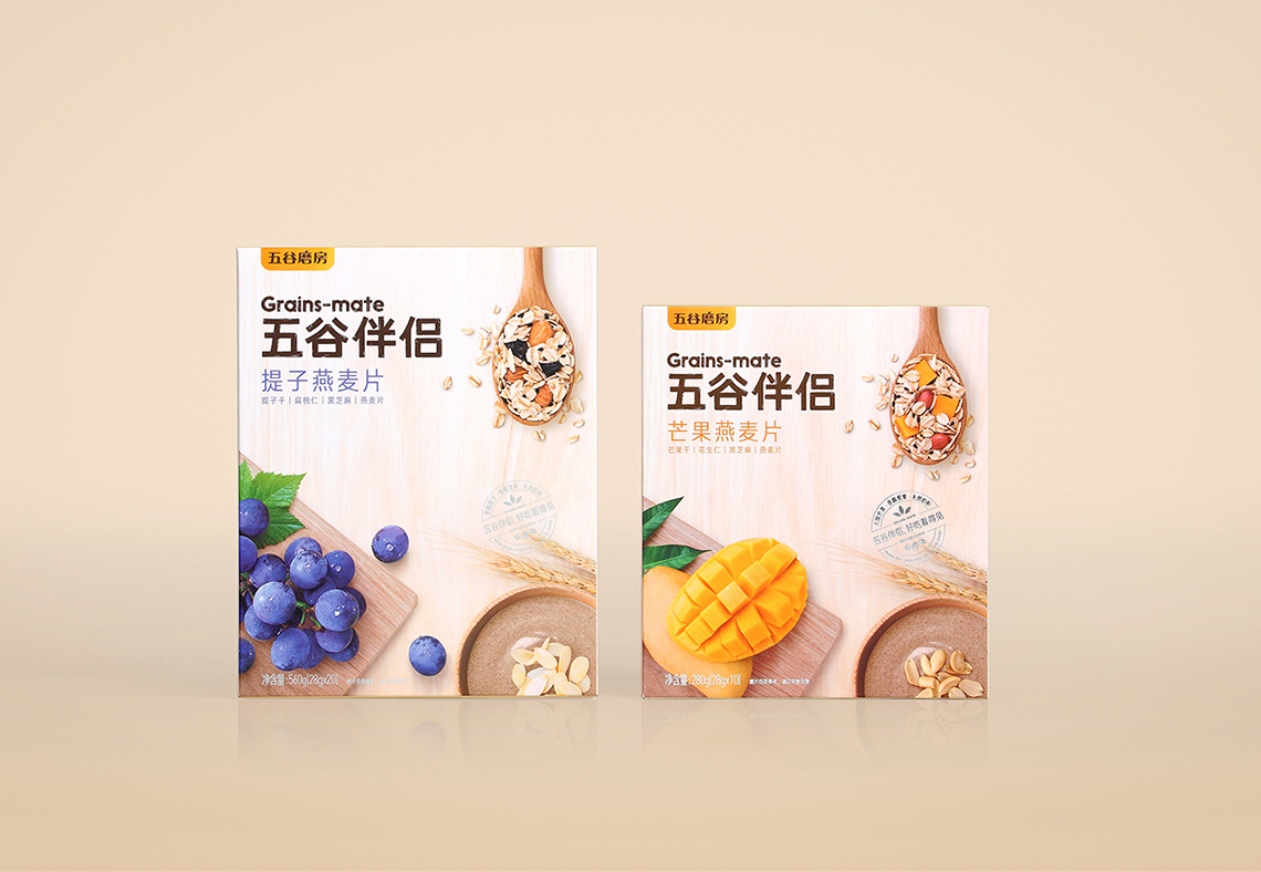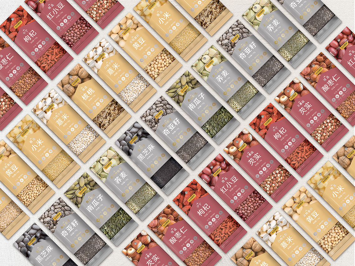 “五谷伴侶”作為搭配食用產(chǎn)品,設(shè)計(jì)思路以展現(xiàn)“原料新鮮健康、口感豐富美味”為主,通過增強(qiáng)整個(gè)系列的食欲感來提升消費(fèi)者購買量。在視覺表現(xiàn)上,形成固定的構(gòu)圖屬式,整體包裝風(fēng)格延續(xù)益元八珍清新自然的風(fēng)格。