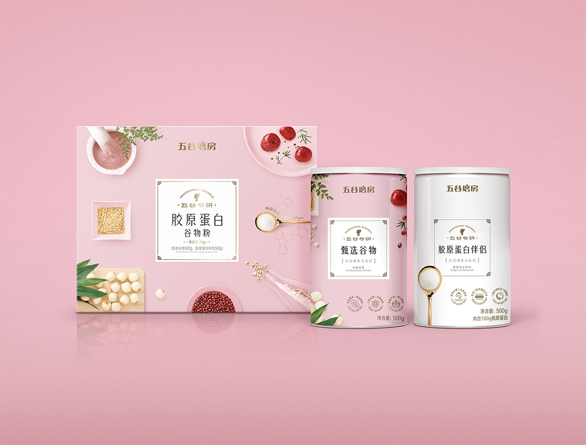 “五谷專研系列”主要針對年輕女性做的一款高端產(chǎn)品,畫面以粉色為主,襯托年輕女性對美的高度追求,同時(shí)原材料的視覺處理也表現(xiàn)極為精致,與產(chǎn)品本身定位高度契合。