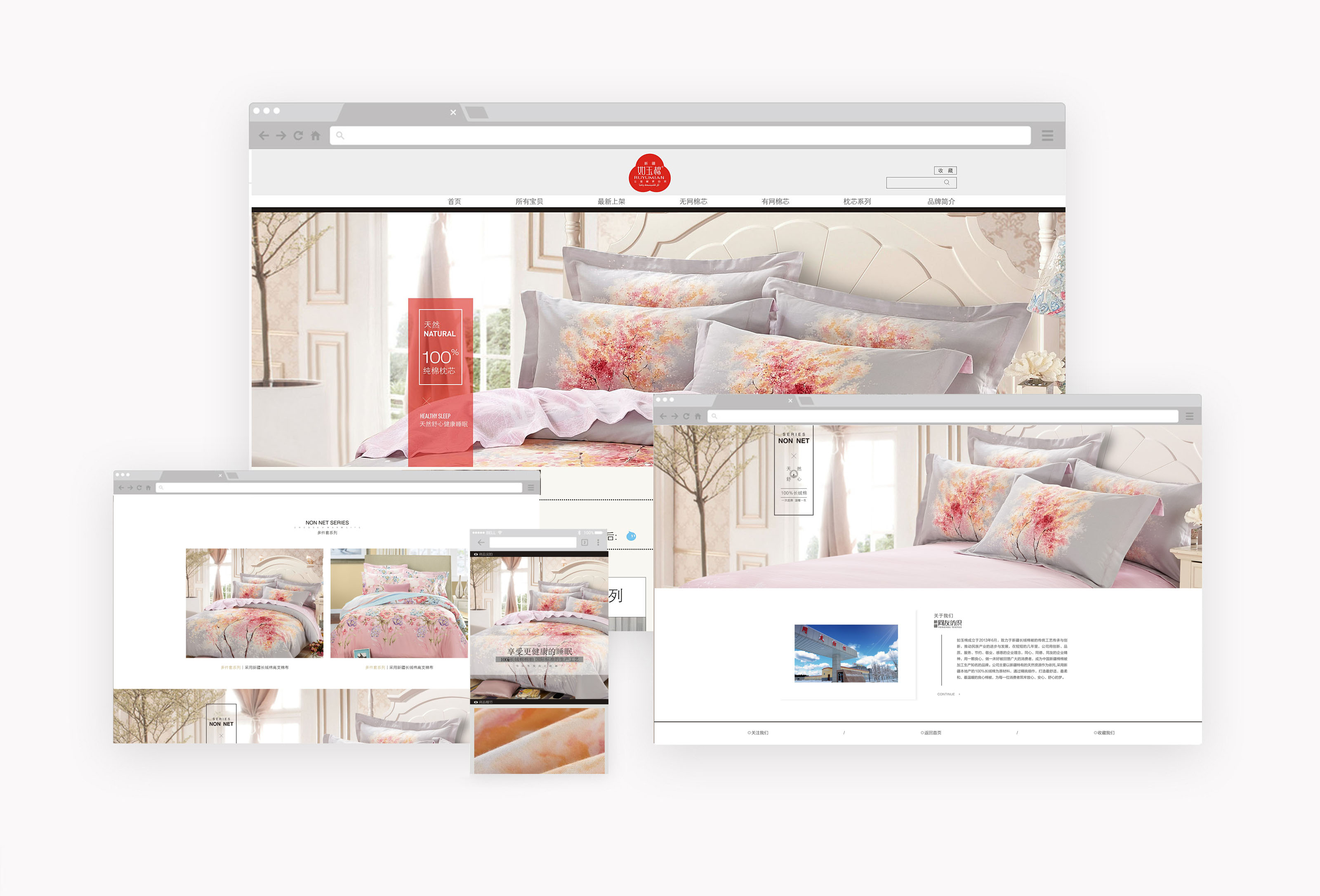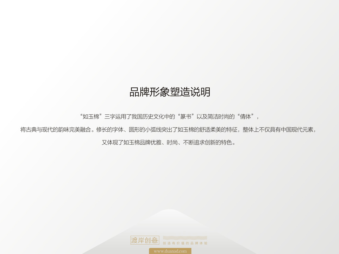 LOGO運用了我國歷史文化中的“篆書”以及簡潔時尚的“倩體”,將古典與現(xiàn)代的韻味完美融合。修長的字體、圓形的小弧線突出了如玉棉的舒適柔美的特征,整體上不僅具有中國現(xiàn)代元素,又體現(xiàn)了如玉棉品牌優(yōu)雅、時尚、不斷追求創(chuàng)新的特色。