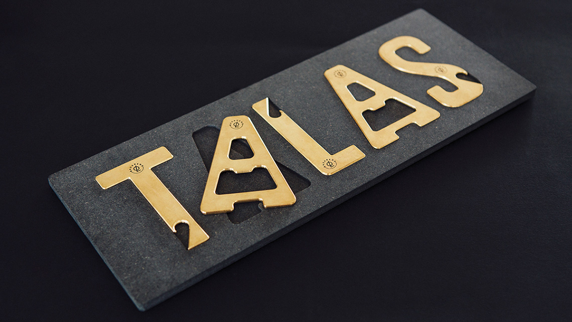 Talas是當?shù)卦挕霸倭摹钡囊馑?,設計師抓住這個主題,將它延伸開來,用印有當?shù)卣乒实膱蠹堊鳛榘b,并且把組成品牌的字母,用黃銅經(jīng)手工打造成不同造型的開瓶器。