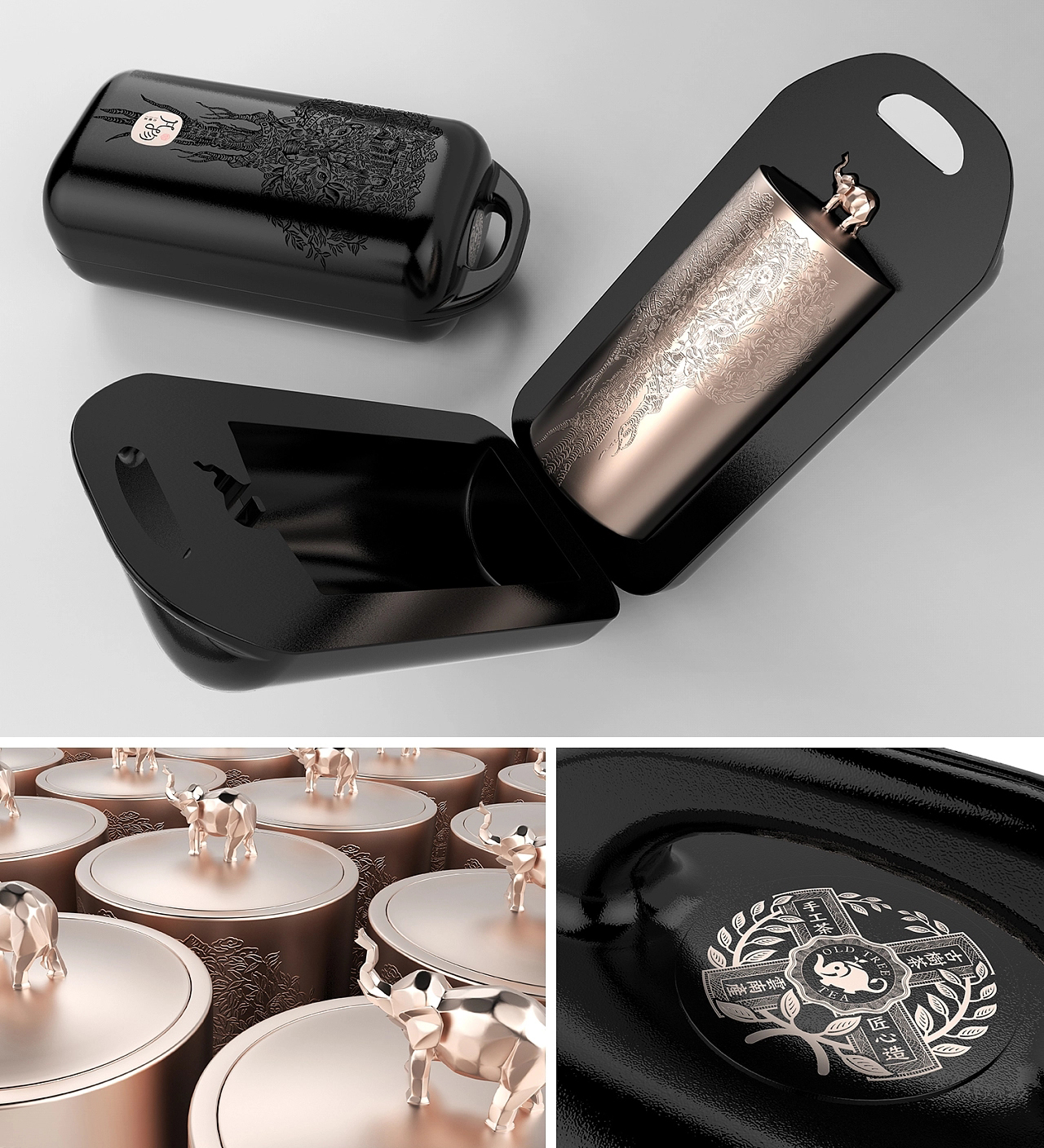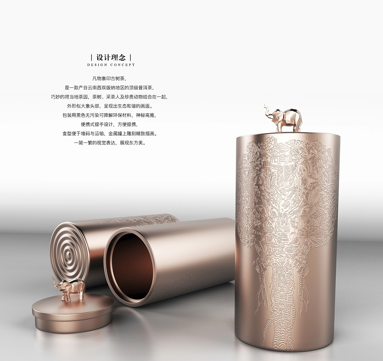 來自云南西雙版納的普洱茶,外包裝也加入當?shù)夭鑸@、采茶人及大象等元素,再現(xiàn)云南的人文地理風情